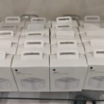 Compact square cube. Smooth finish. Minimal Apple branding. Easy to pack for travel.